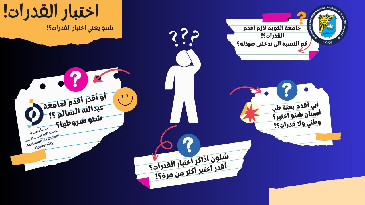 - أغلب كليات الكويت وتخصصات البعثات للطب والصيدلة والهندسة تطلب منك اجتياز اختبار القدرات. ولمعرفة متطلبات كل جامعة وكلياتها اضغط على الروابط في الأسفل: