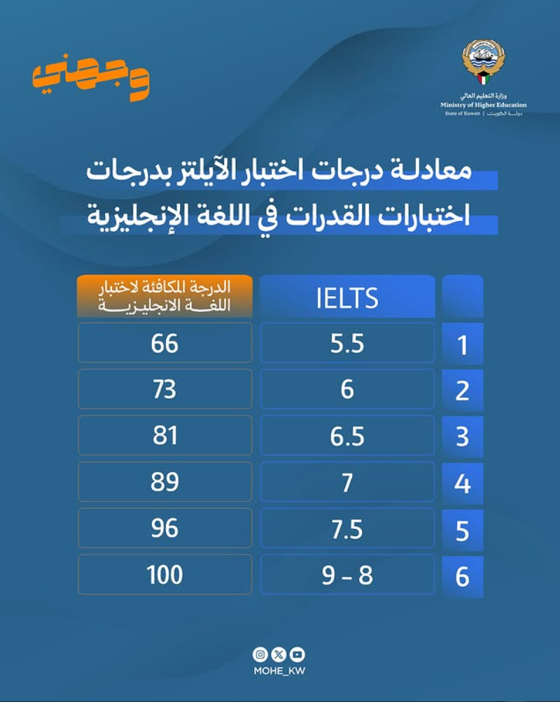 مثلاً تخيلوا بدر قدم اختبار آيلتس وكانت نتيجته 6.5. باستخدام الجدول نقدر نعادل أن درجة بدر تساوي 81 في نتيجة اختبار قدرات اللغة الانجليزية ✅. واذا محتار بين اختبار قدرات اللغة الانجليزية او الايلتز ننصح باختبار القدرات لانه اسهل.